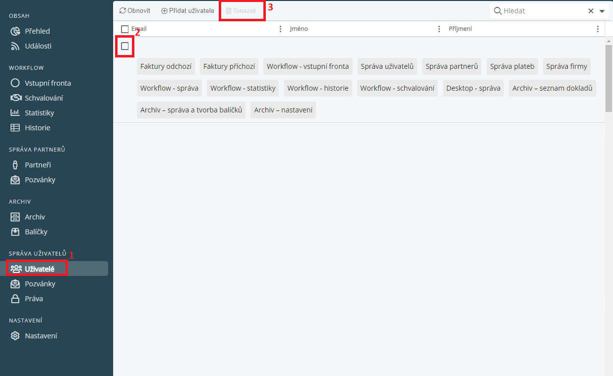 Odstranění uživatele z agendy provedeme přes menu Uživatelé (1), zaškrtneme záznam dotyčného uživatele (2) a klikneme na tlačítko Smazat (3). Tímto způsobem lze odstranit i více uživatelů najednou.