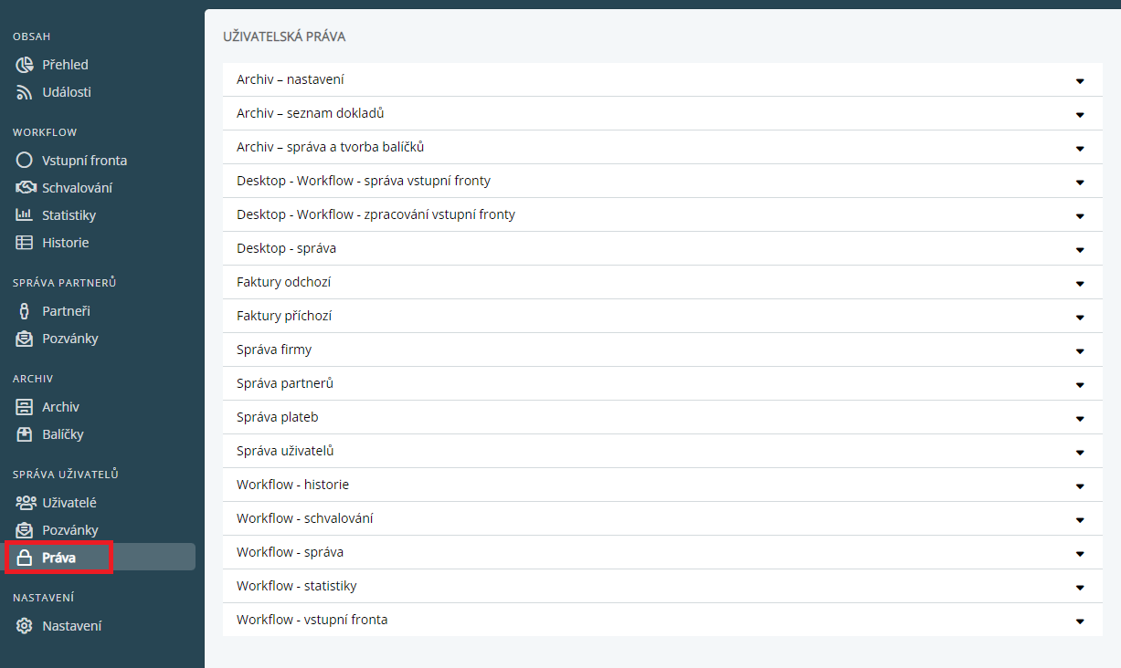 Základní nastavení uživatelských oprávnění lze provést již v pozvánce uživateli. K pozdějším úpravám oprávnění uživatelů slouží menu Práva.