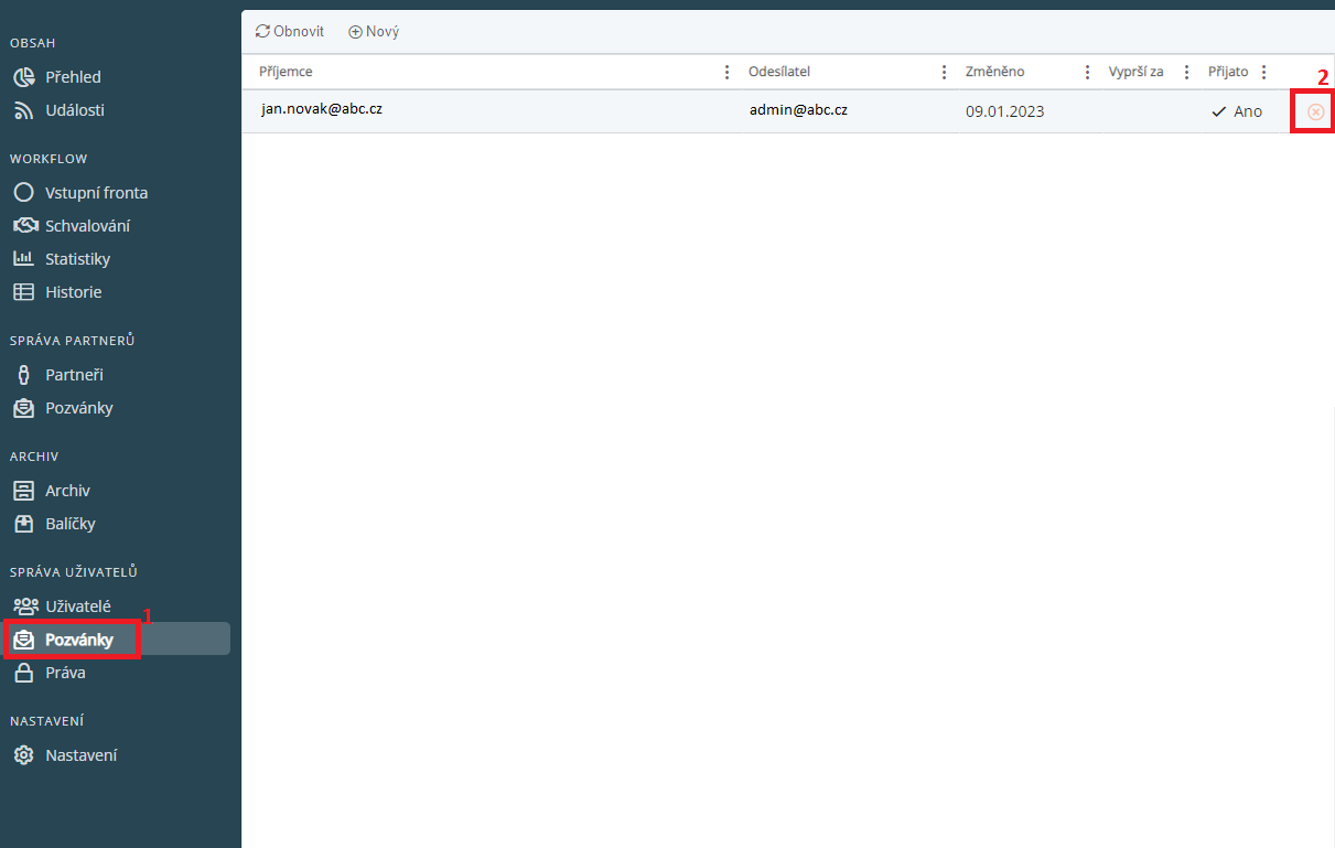 Pokud chceme odstranit uživatele, který dosud nepřijal pozvánku, můžeme tak učinit z menu Pozvánky (1) kliknutím na ikonku křížku (2).