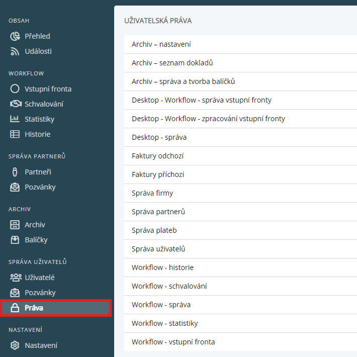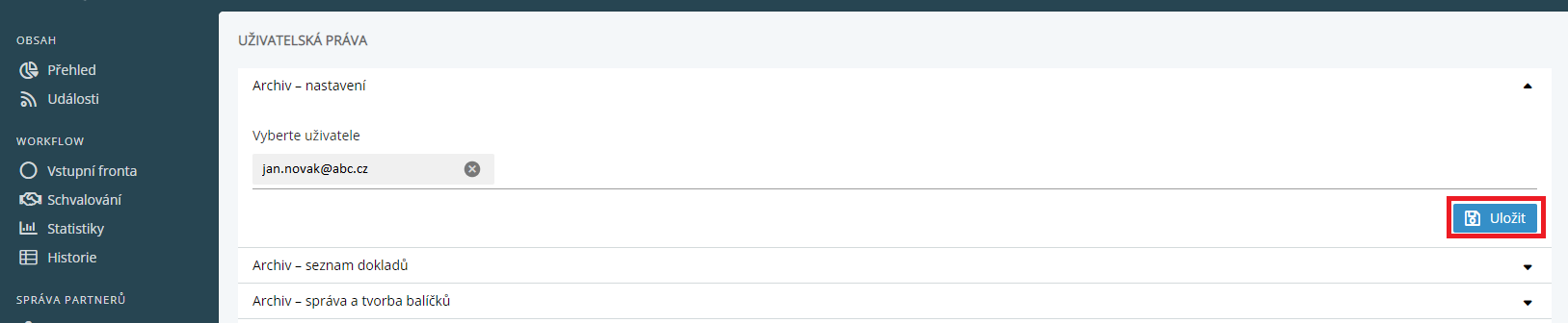 Oprávnění existujícího uživatele se nastavuje v panelu Správa uživatelů, sekce Práva.