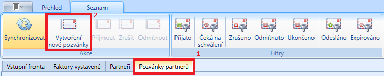 Pozvánku novému partnerovi lze odeslat v záložce Pozvánky partnerů (1) tlačítkem Vytvoření nové pozvánky (2)