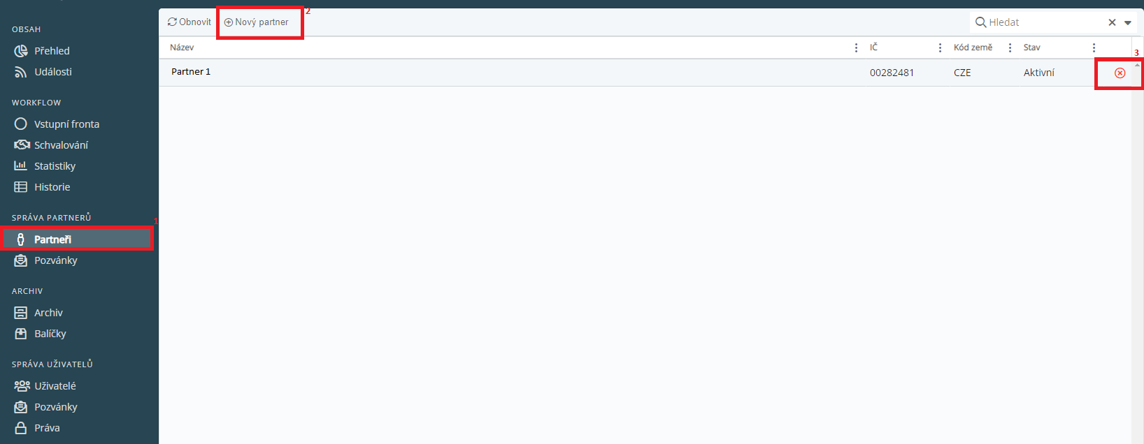 Přehled partnerů lze zobrazit v sekci Správa partnerů, menu Partneři (1).